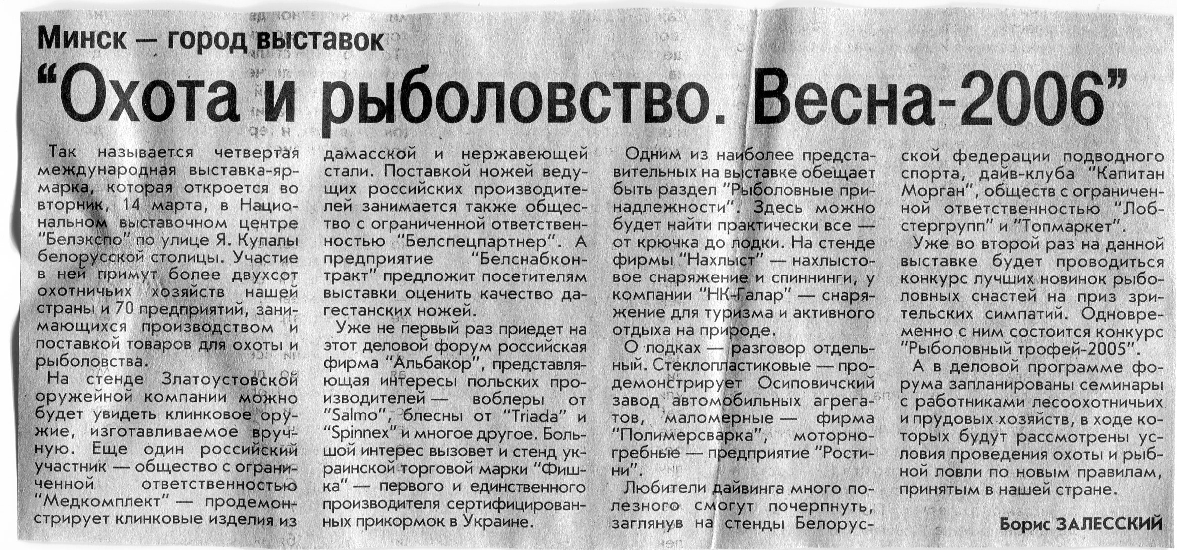 Залесский, Б. "Охота и рыболовство. Весна-2006" / Б. Залесский // Вечерний Минск. – 2006. – 13 мар.