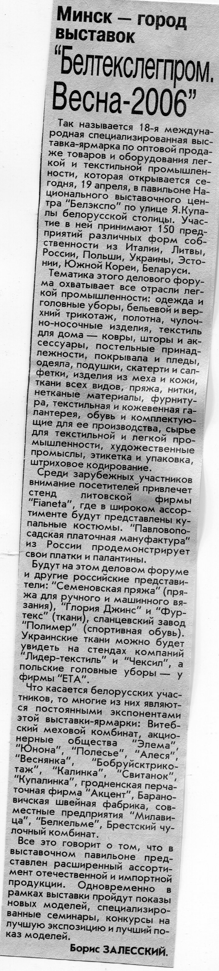 Залесский, Б. "Белтекслегпром. Весна-2006" / Б. Залесский // Вечерний Минск. – 2006. – 19 апр.