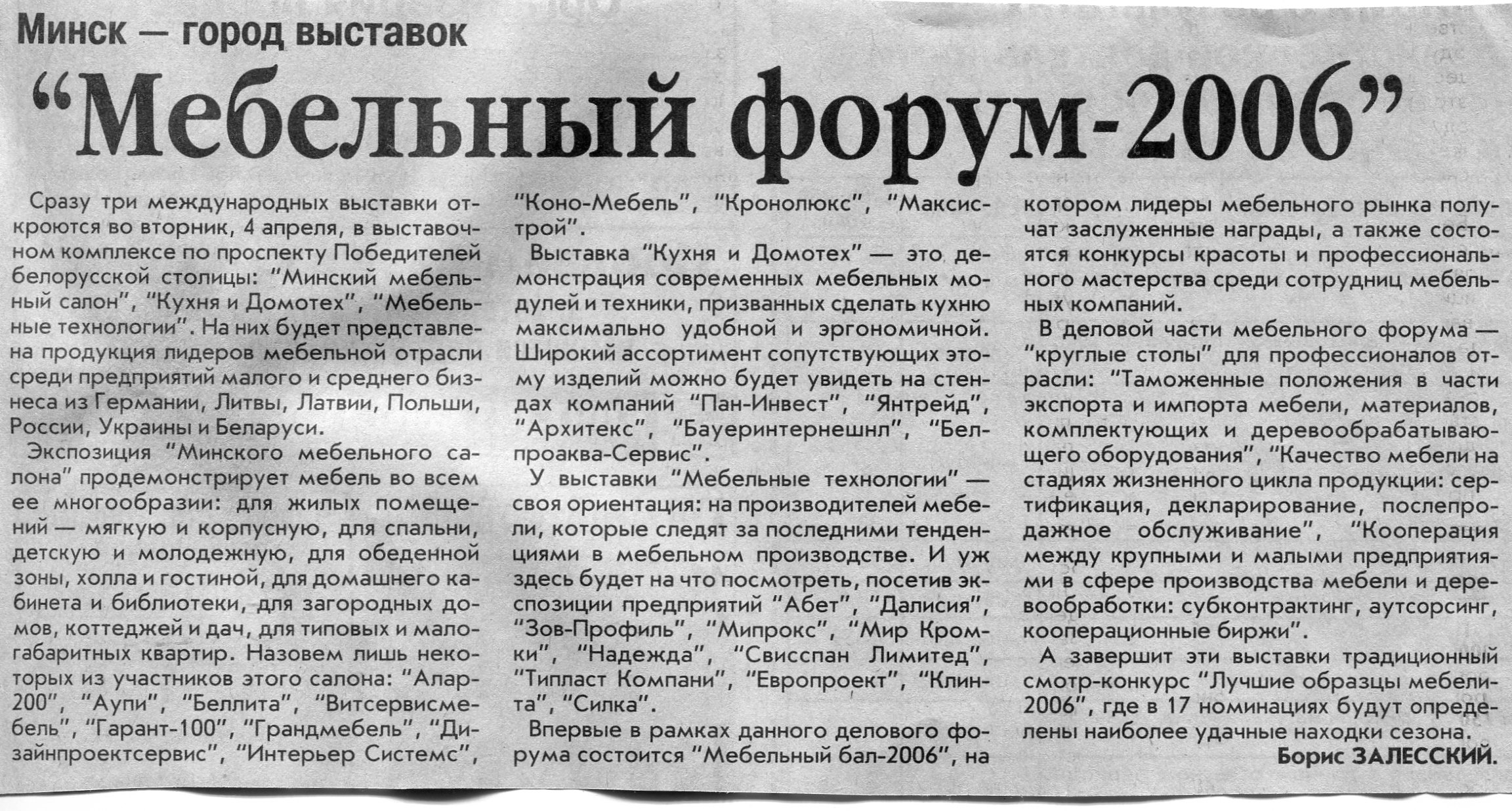 Залесский, Б. "Мебельный салон-2006" / Б. Залесский // Вечерний Минск. – 2006. – 3 апр.
