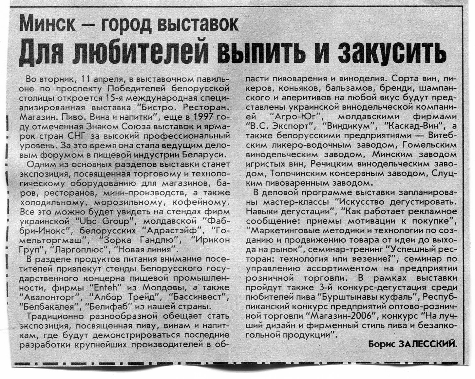 Залесский, Б. Для любителей выпить и закусить / Б. Залесский // Вечерний Минск. – 2006. – 10 апр.