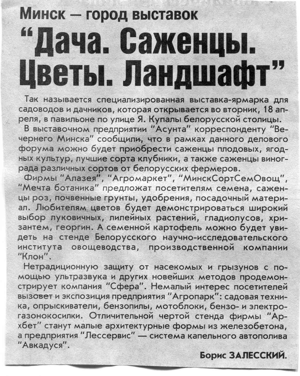 Залесский, Б. "Дача. Саженцы. Цветы. Ландшафт" / Б. Залесский // Вечерний Минск. – 2006. – 17 апр.