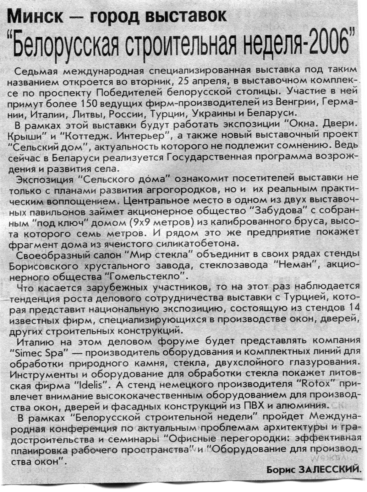 Залесский, Б. "Белорусская строительная неделя-2006" / Б. Залесский // Вечерний Минск. – 2006. – 24 апр.