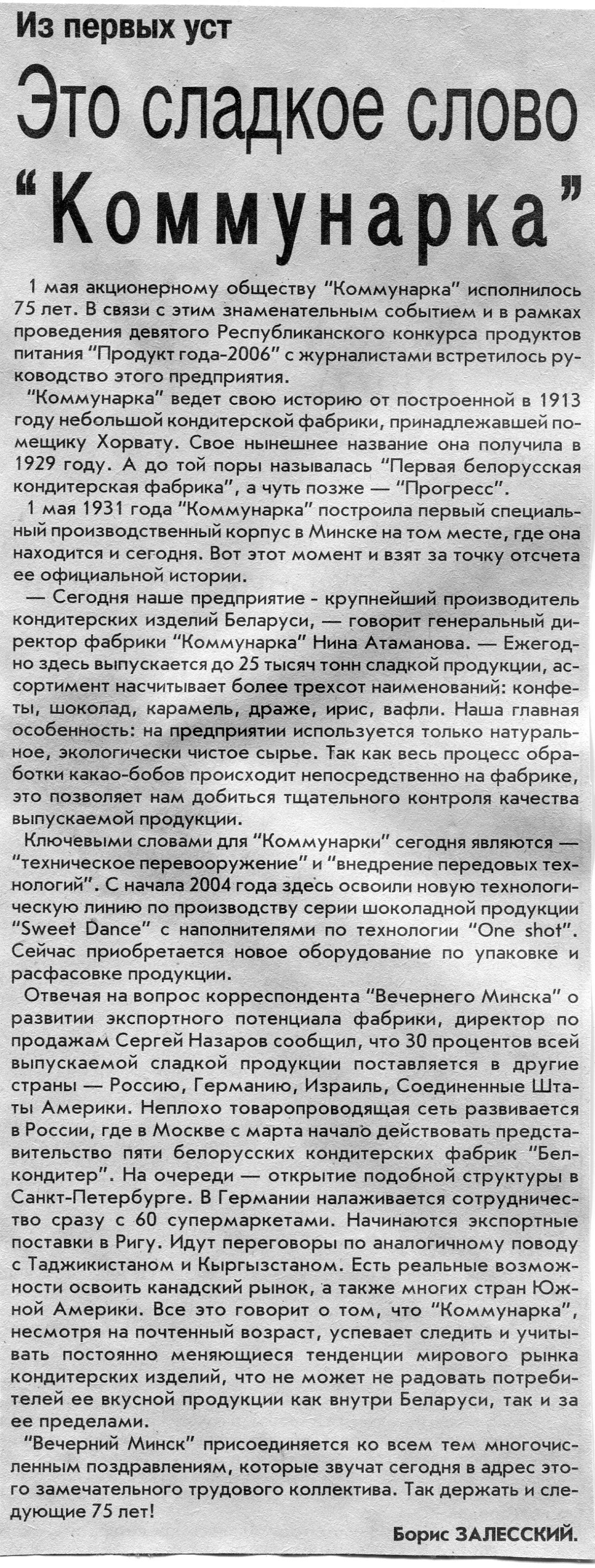 Залесский, Б. Это сладкое слово "Коммунарка" / Б. Залесский // Вечерний Минск. – 2006. – 16 мая.