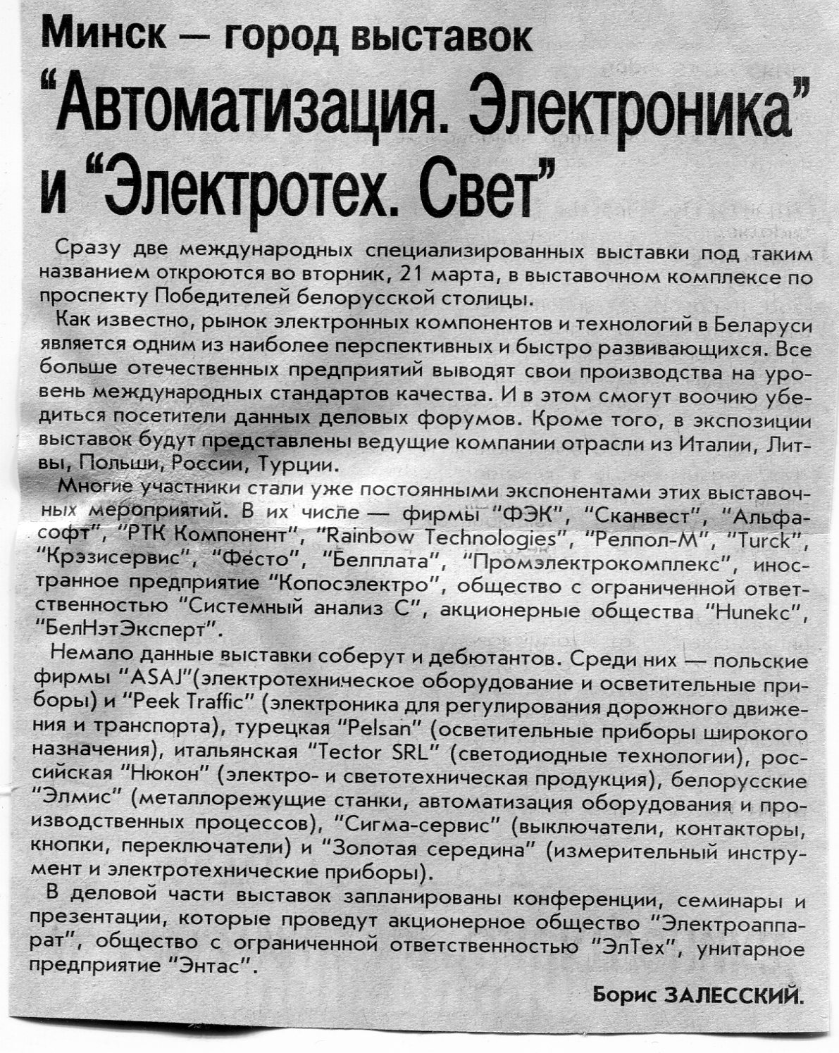 Залесский, Б. "Автоматизация. Электроника" и "Электротех. Свет" / Б. Залесский // Вечерний Минск. – 2006. – 20 мар.