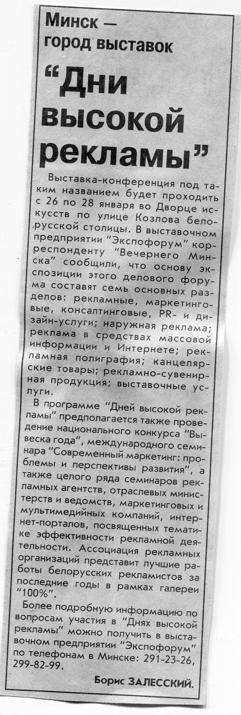 Залесский, Б. "Дни высокой рекламы" / Б. Залесский // Вечерний Минск. – 2005. - 10 янв.