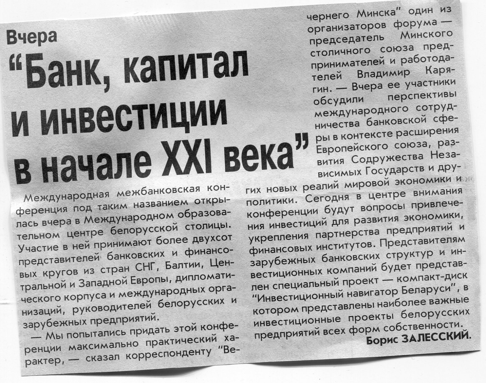 Залесский, Б. "Банк, капитал и инвестиции в начале XXI века" / Б. Залесский // Вечерний Минск. – 2004. - 7 дек.