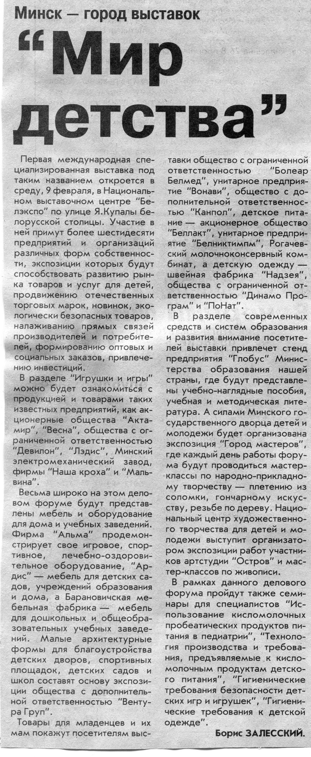 Залесский, Б. "Мир детства" / Б. Залесский // Вечерний Минск. – 2005. - 7 февр.