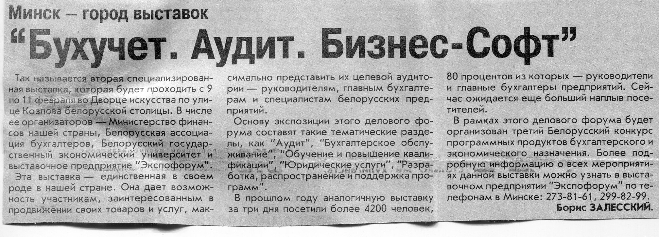 Залесский, Б. "Бухучет. Аудит. Бизнес-Софт" / Б. Залесский // Вечерний Минск. – 2005. - 26 янв.