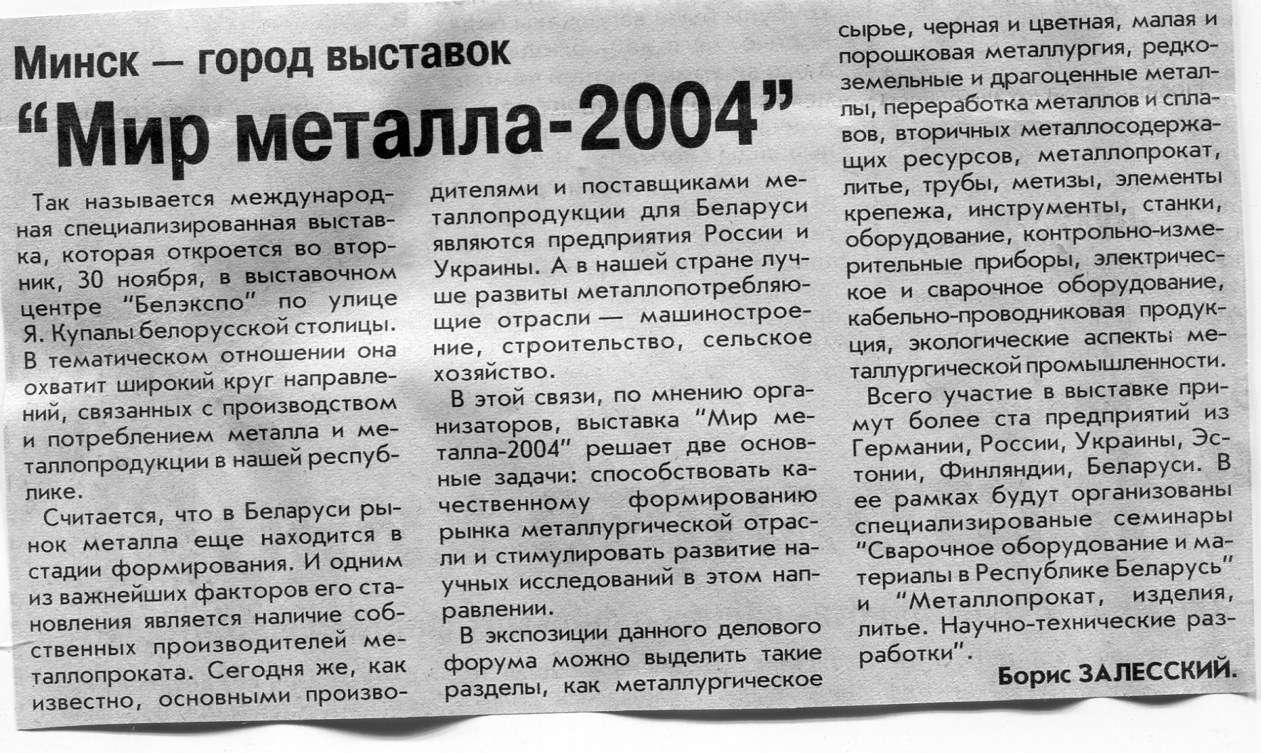 Залесский, Б. "Мир металла-2004" / Б. Залесский // Вечерний Минск. – 2004. - 29 нояб.