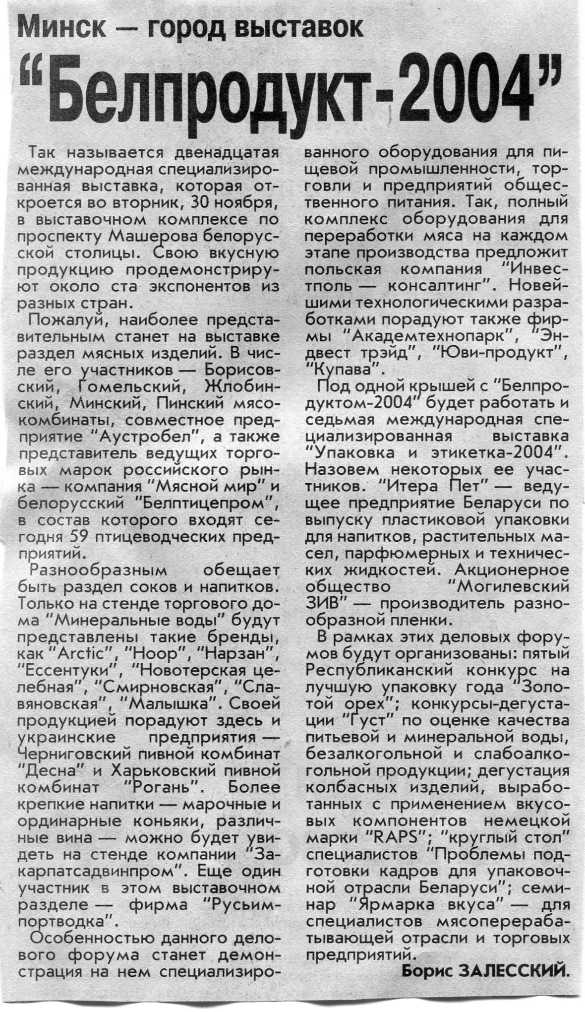 Залесский, Б. "Белпродукт-2004" / Б. Залесский // Вечерний Минск. – 2004. - 25 нояб.