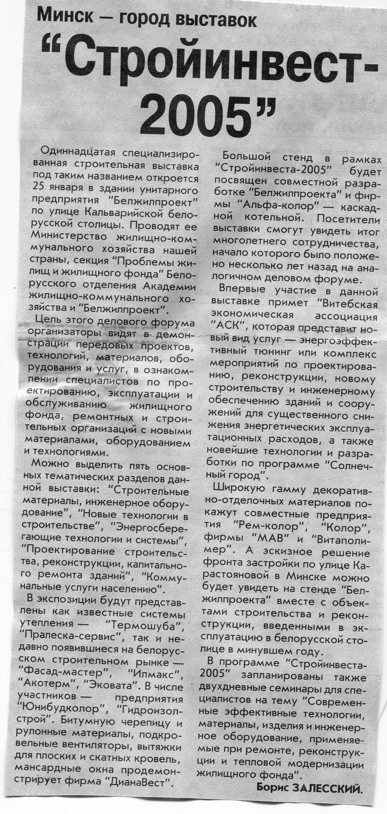 Залесский, Б. "Стройинвест-2005" / Б. Залесский // Вечерний Минск. – 2005. - 19 янв.
