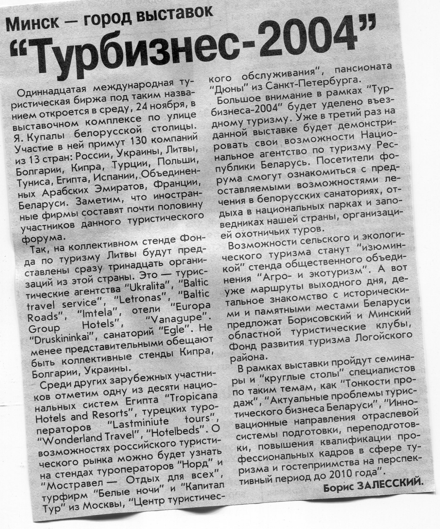 Залесский, Б. "Турбизнес-2004" / Б. Залесский // Вечерний Минск. – 2004. - 23 нояб.