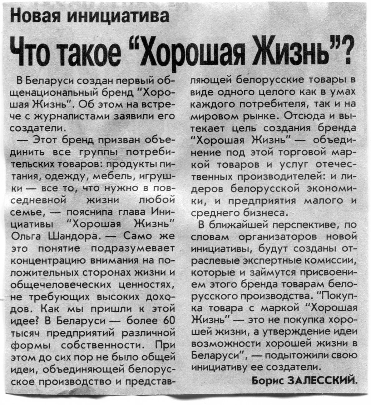 Залесский, Б. Что такое "Хорошая Жизнь"? / Б. Залесский // Вечерний Минск. – 2004. - 28 окт.
