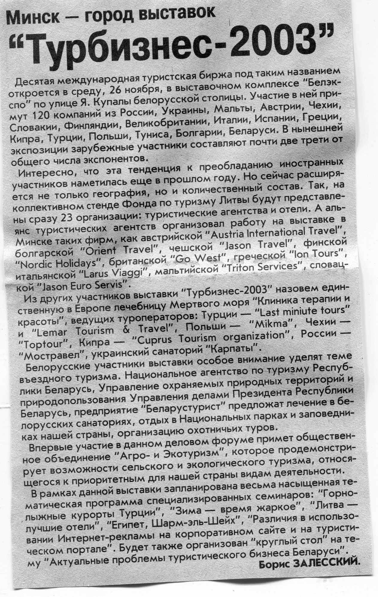 Залесский, Б. "Турбизнес-2003" / Б. Залесский // Вечерний Минск. – 2003. – 25 нояб.