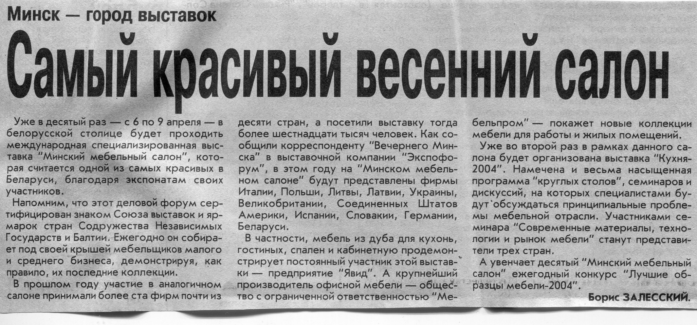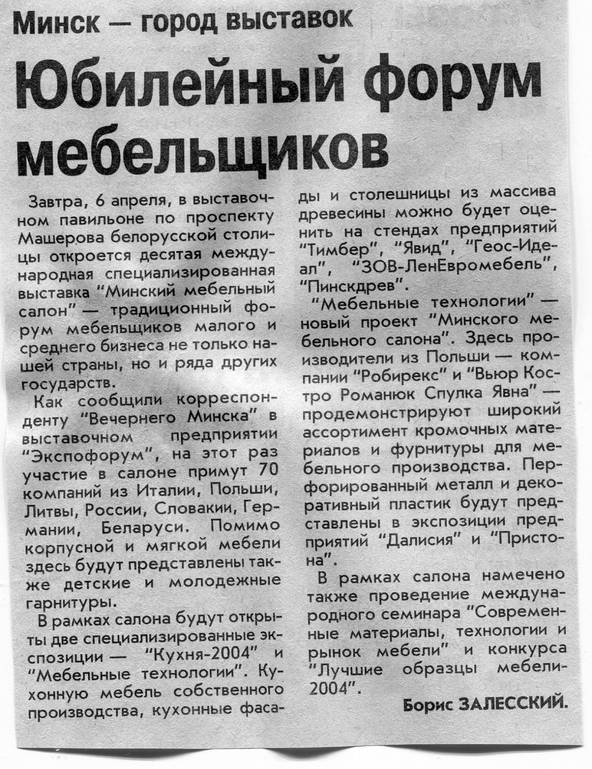 Залесский, Б. Юбилейный форум мебельщиков / Б. Залесский // Вечерний Минск. – 2004. – 5 апр.
