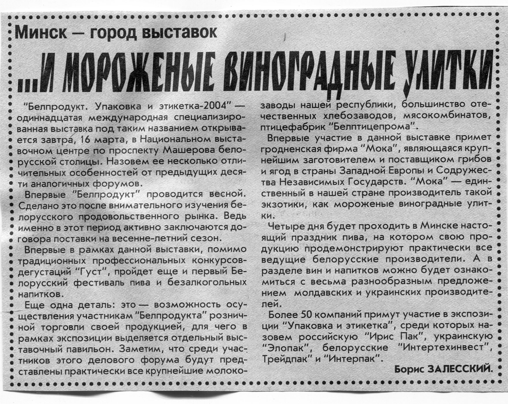 Залесский, Б. "Белпродукт-2003" / Б. Залесский // Вечерний Минск. – 2003. – 3 дек.