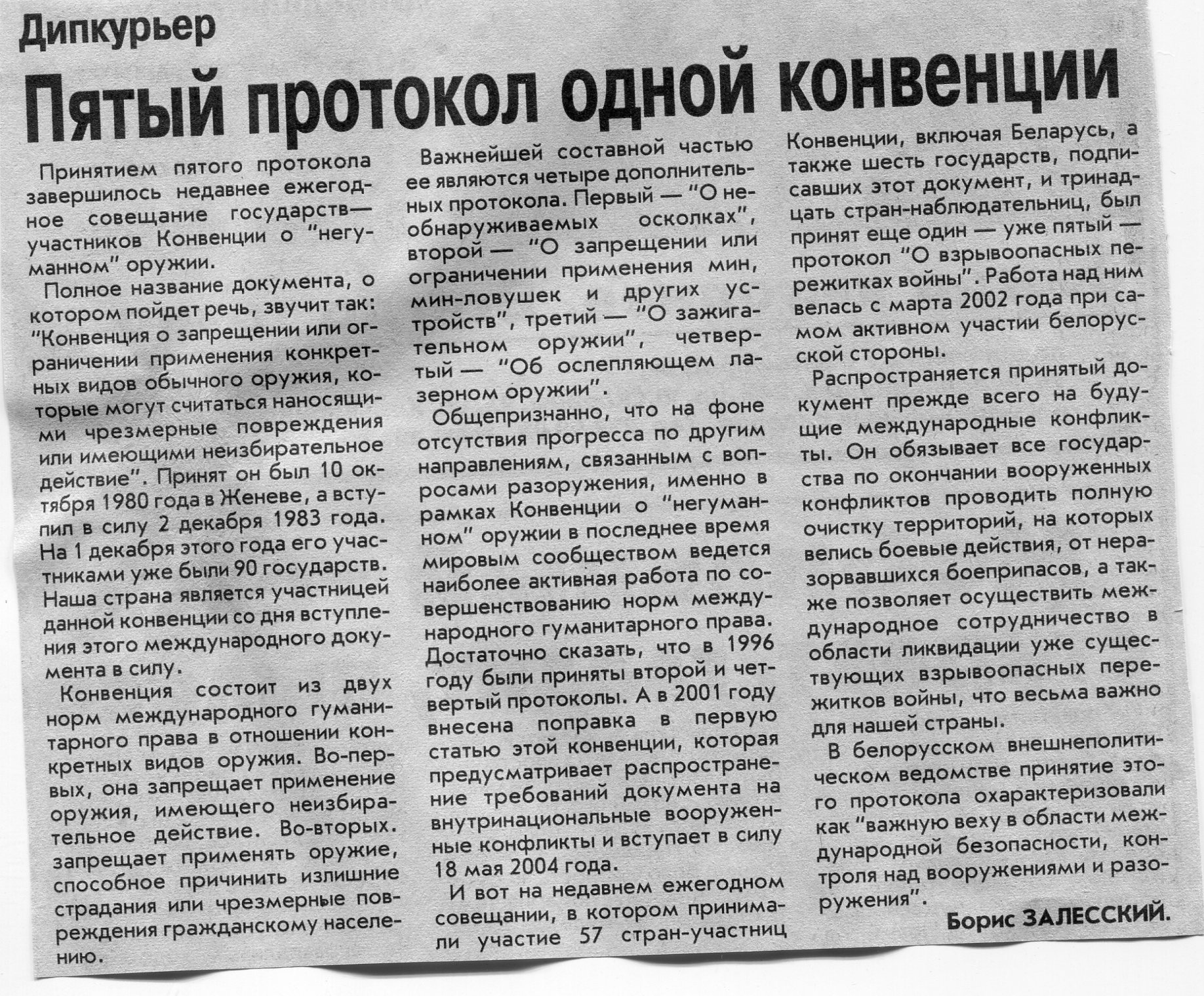 Залесский, Б. Пятый протокол одной конвенции / Б. Залесский // Вечерний Минск. – 2003. – 17 дек.