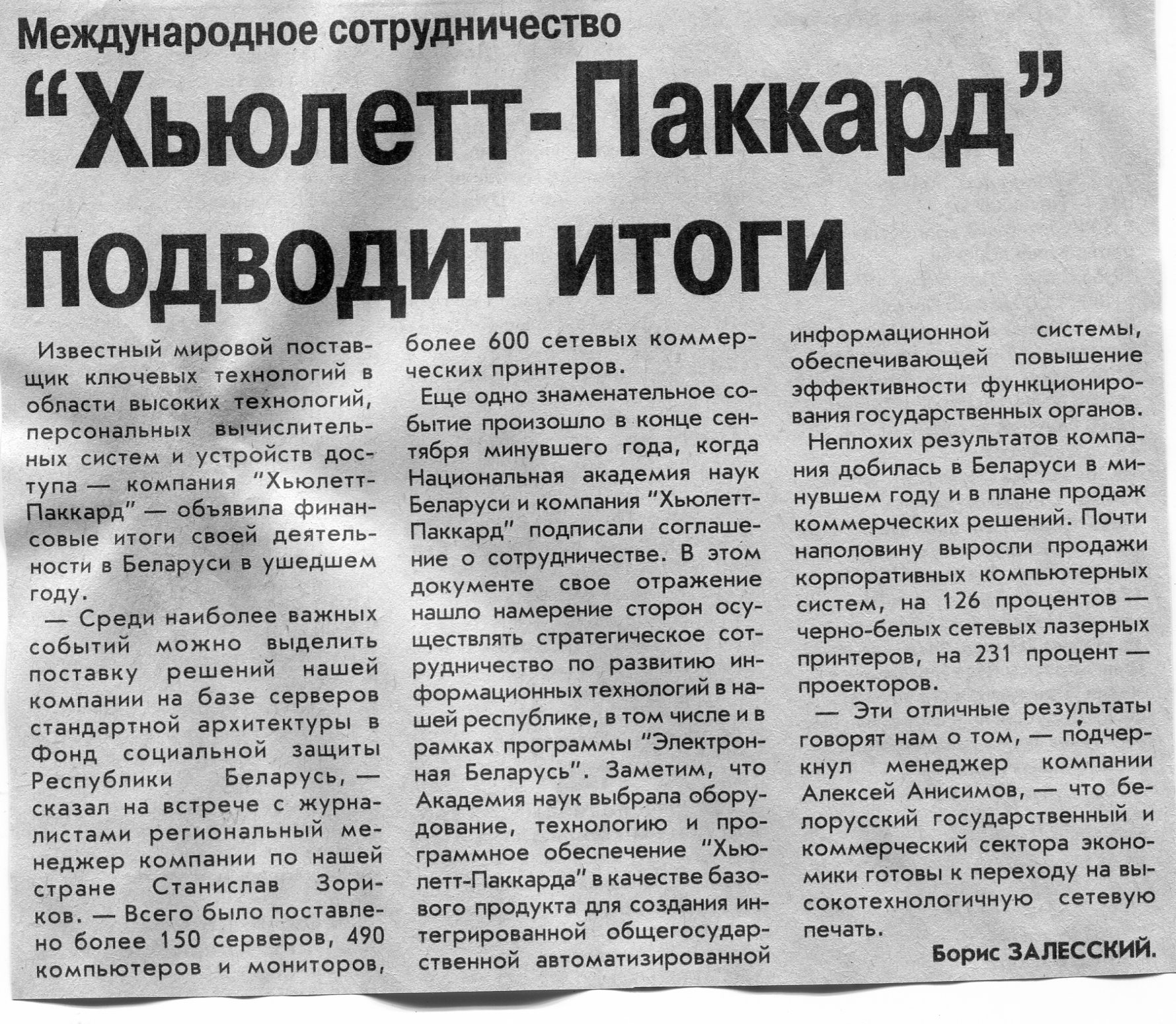 Залесский, Б. "Хьюлетт-Паккард" подводит итоги / Б. Залесский // Вечерний Минск. – 2004. – 3 янв.