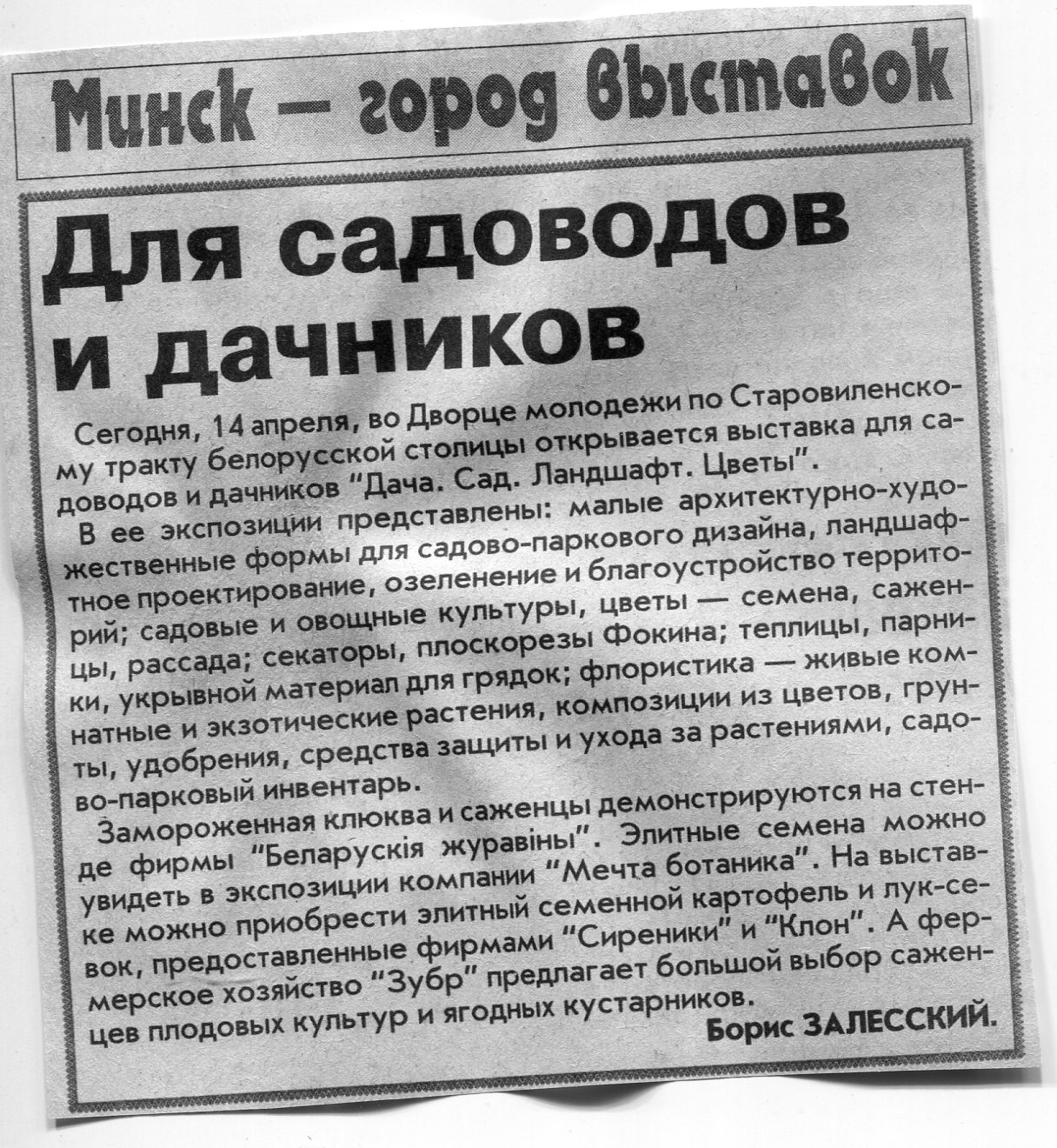 Залесский, Б. Для садоводов и дачников / Б. Залесский // Вечерний Минск. – 2004. - 14 апр.