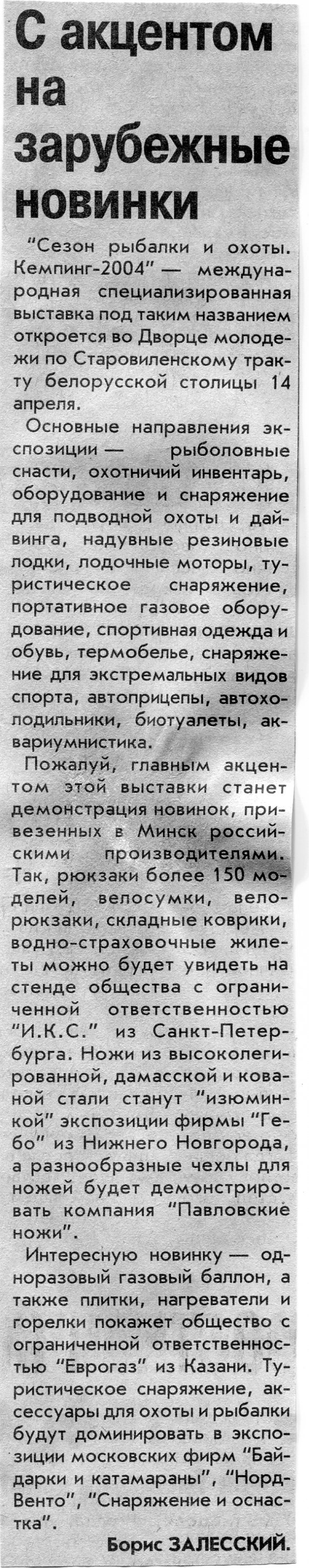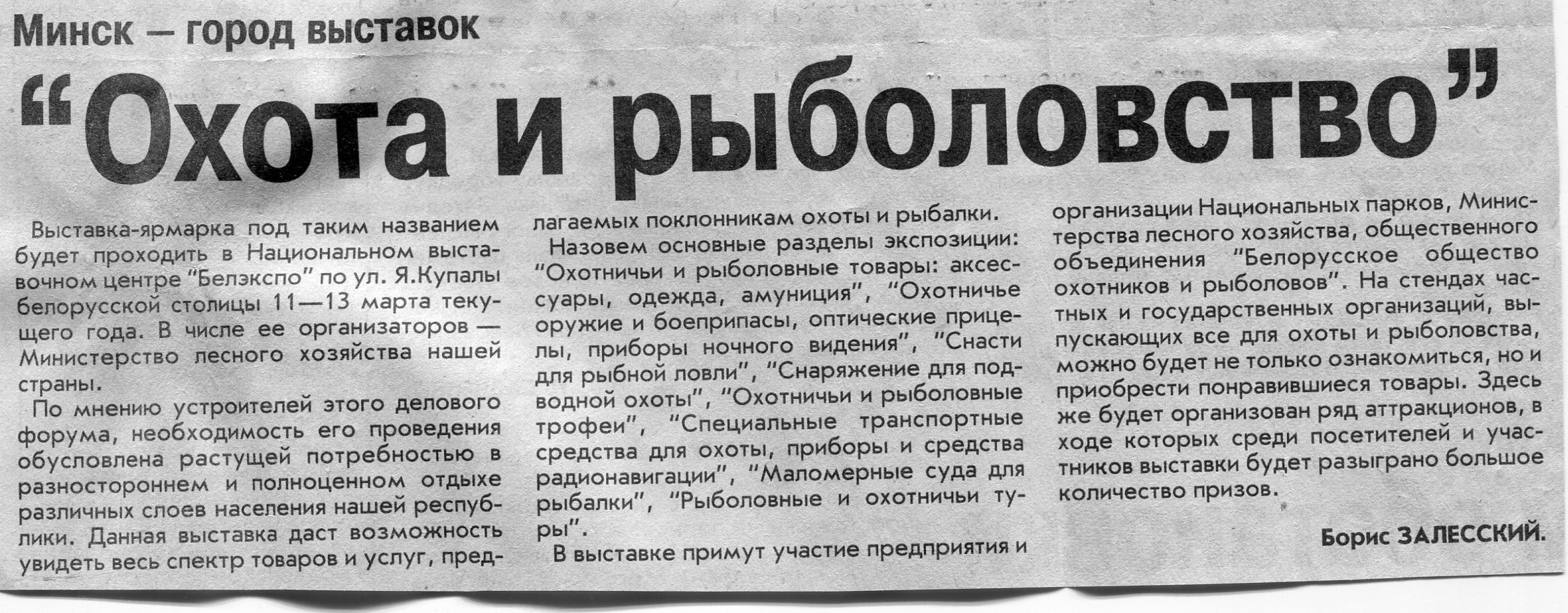 Залесский, Б. "Охота и рыболовство" / Б. Залесский // Вечерний Минск. – 2004. – 21 янв.