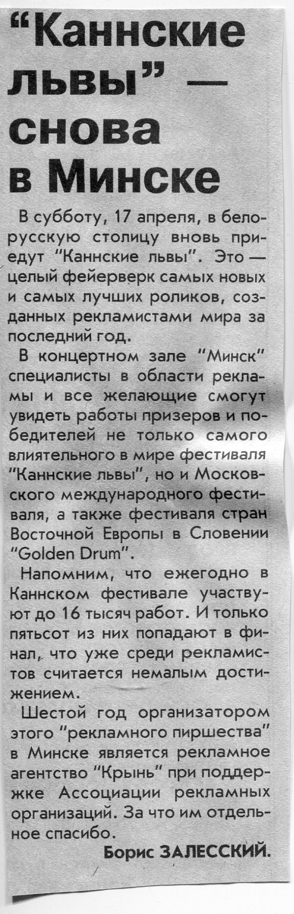 Залесский, Б. "Каннские львы" - снова в Минске / Б. Залесский // Вечерний Минск. – 2004. - 13 апр.