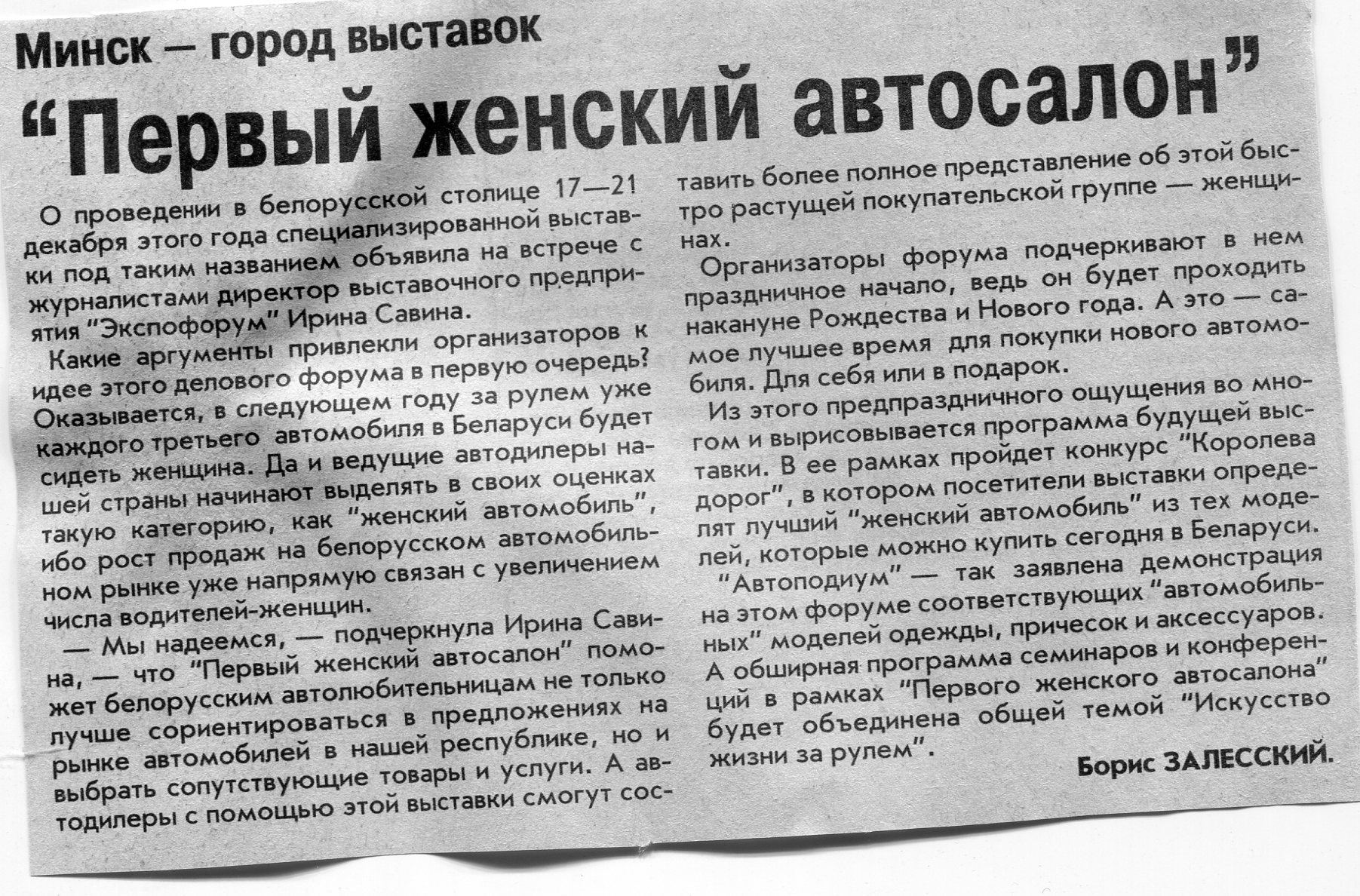 Залесский, Б. "Первый женский автосалон" / Б. Залесский // Вечерний Минск. – 2003. – 18 нояб.
