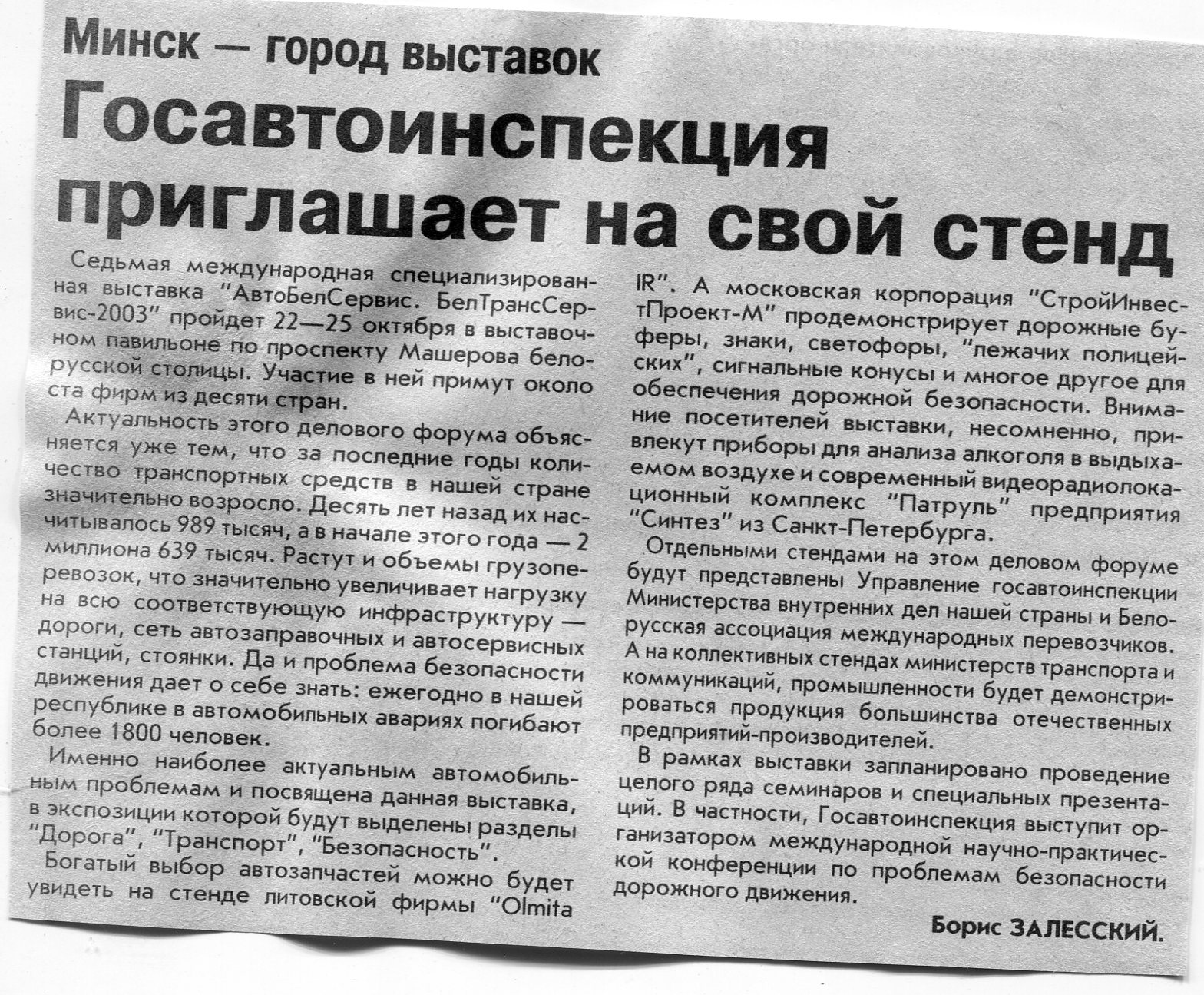 Залесский, Б. Госавтоинспекция приглашает на свой стенд / Б. Залесский // Вечерний Минск. – 2003. – 14 окт.