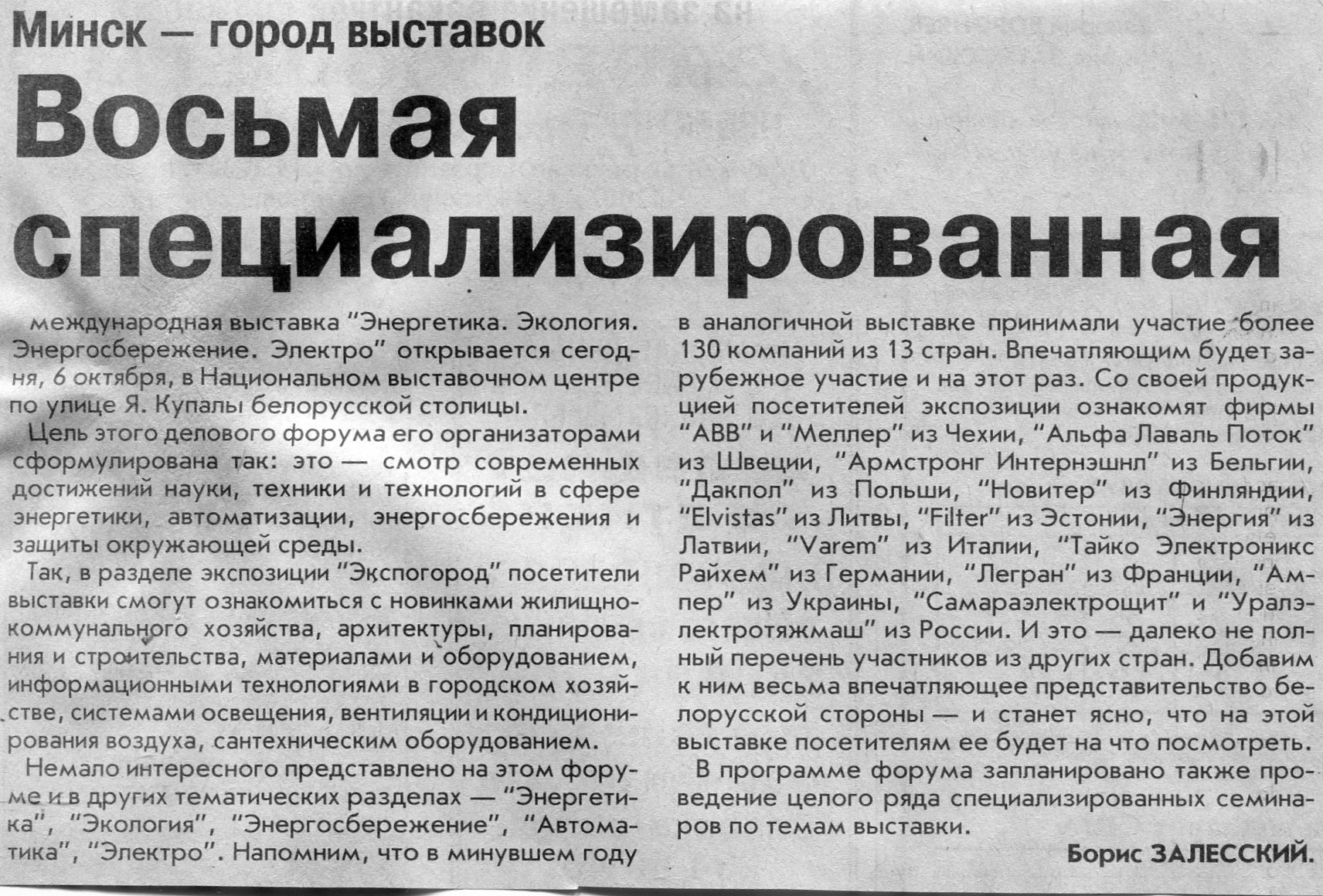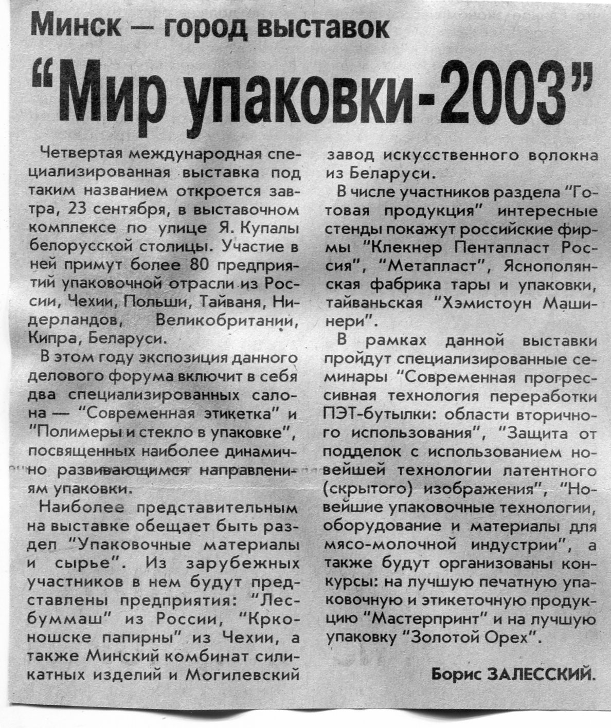 Залесский, Б. "Мир упаковки-2003" / Б. Залесский // Вечерний Минск. – 2003. – 22 сент.