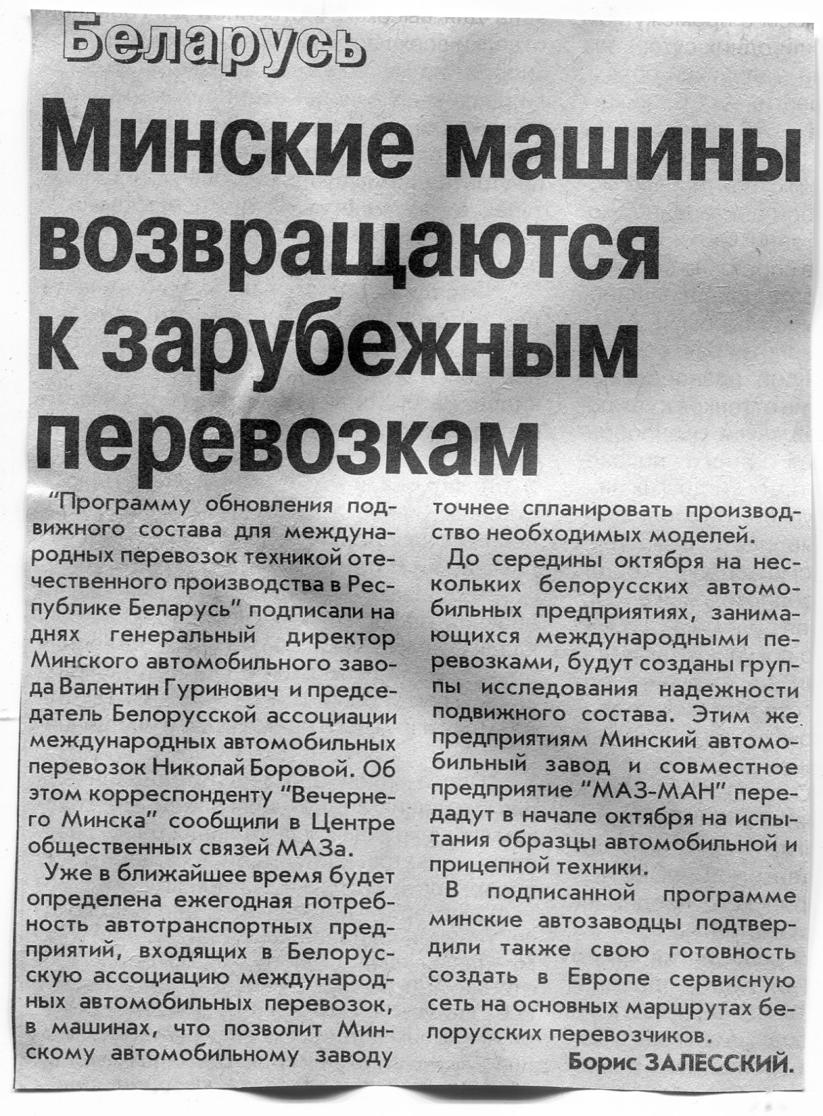 Залесский, Б. Минские машины возвращаются к зарубежным перевозкам / Б. Залесский // Вечерний Минск. – 2003. – 15 сент.