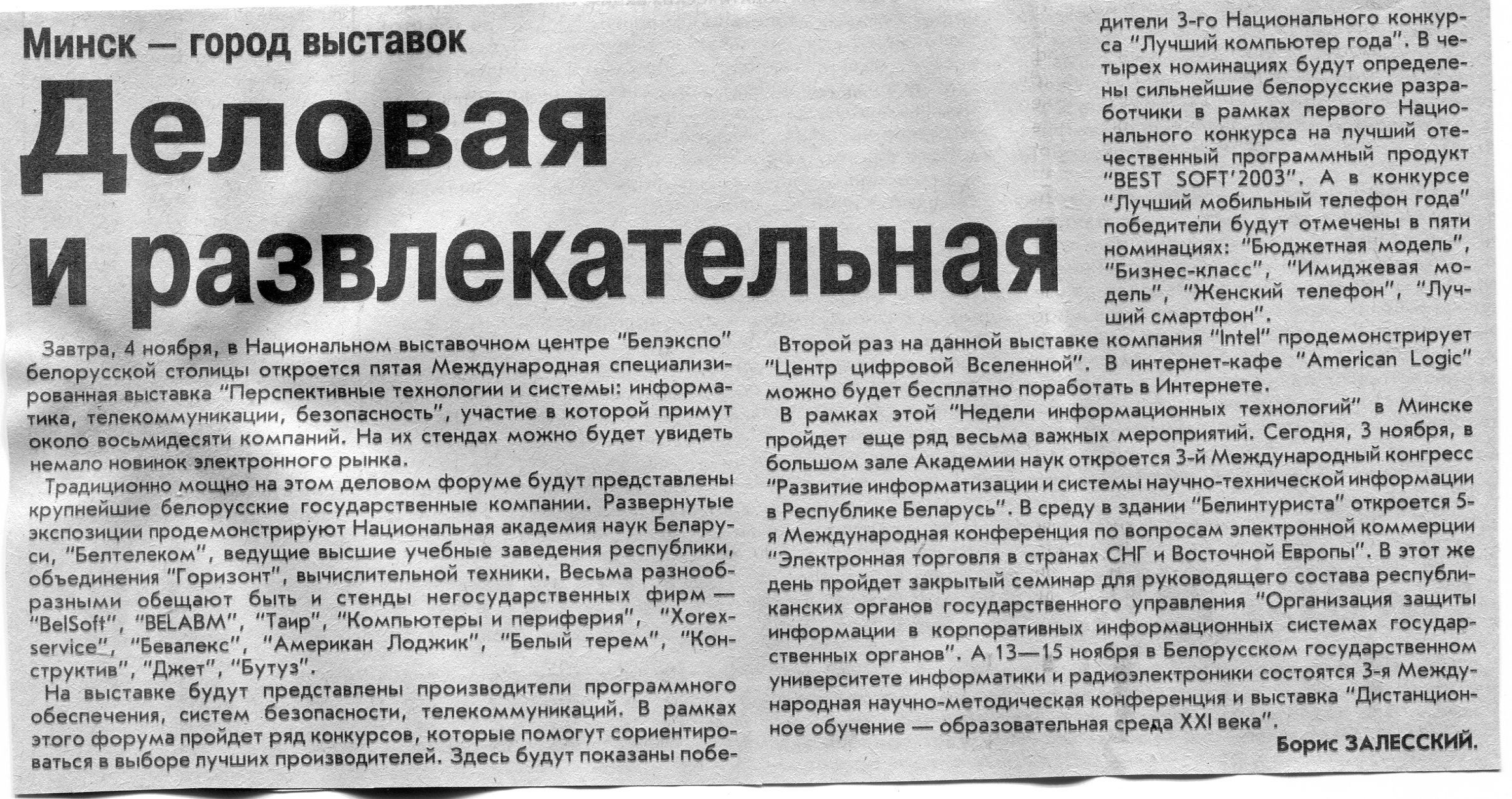 Залесский, Б. Деловая и развлекательная / Б. Залесский // Вечерний Минск. – 2003. – 3 нояб.