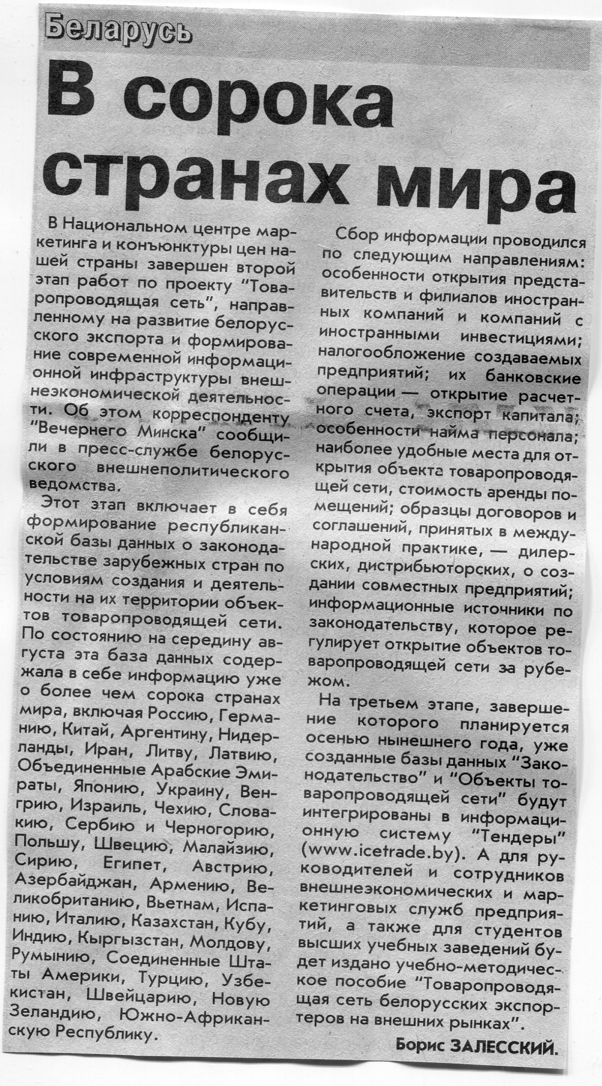 Залесский, Б. В сорока странах мира / Б. Залесский // Вечерний Минск. – 2003. – 26 авг.