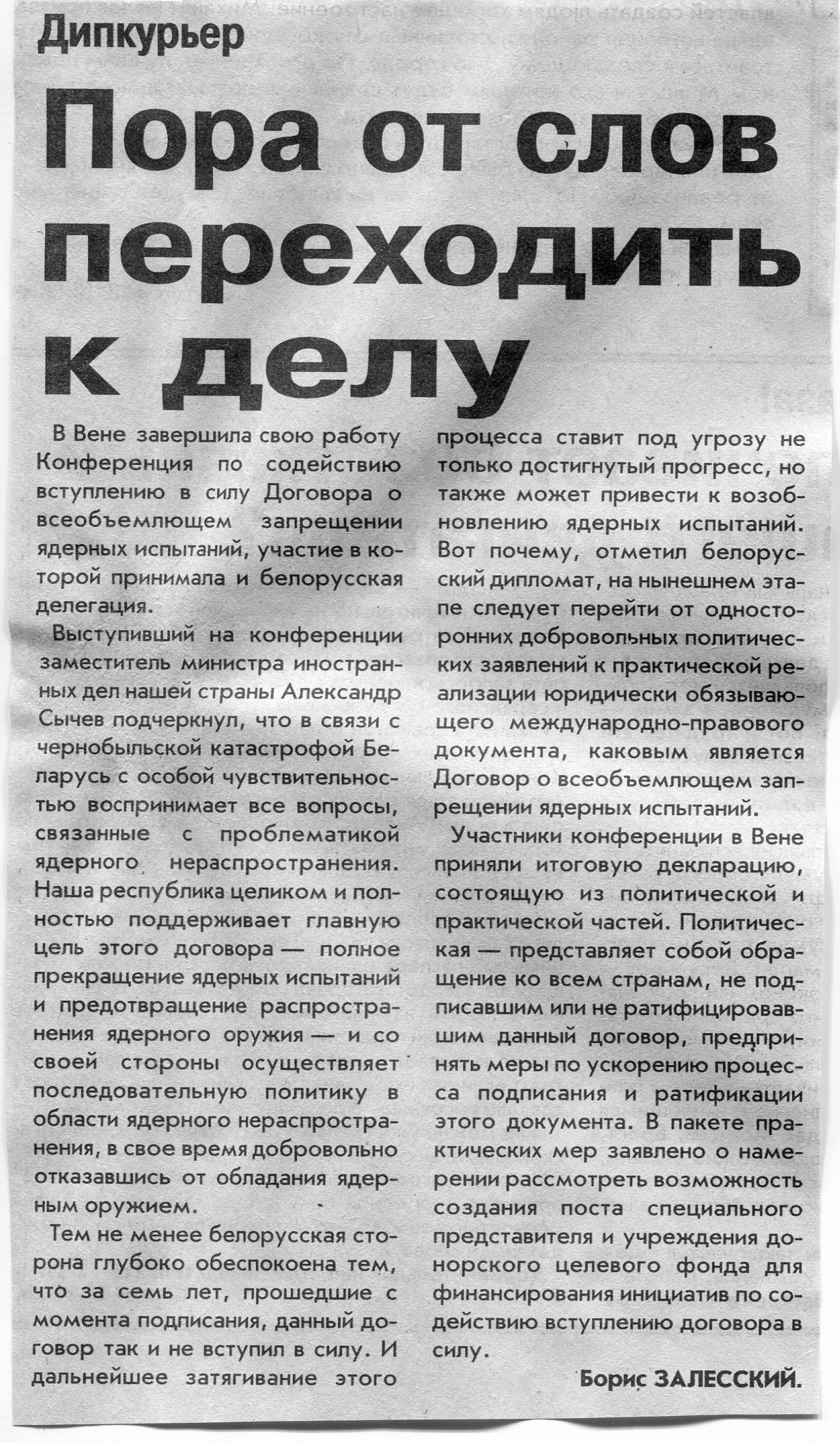 Залесский, Б. Пора от слов переходить к делу / Б. Залесский // Вечерний Минск. – 2003. – 16 сент.
