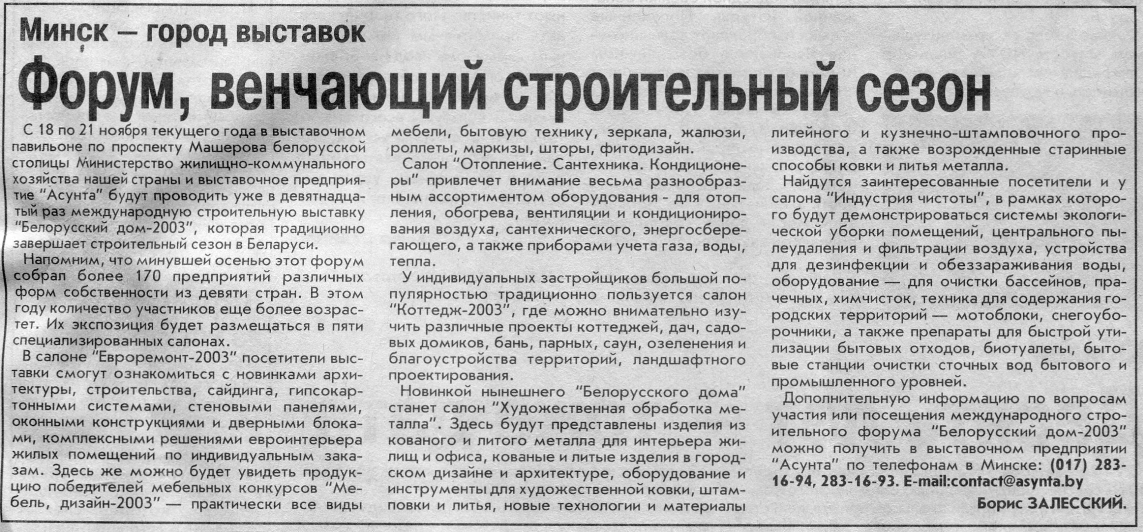 Залесский, Б. Форум, венчающий строительный сезон / Б. Залесский // Вечерний Минск. – 2003. – 24 сент.
