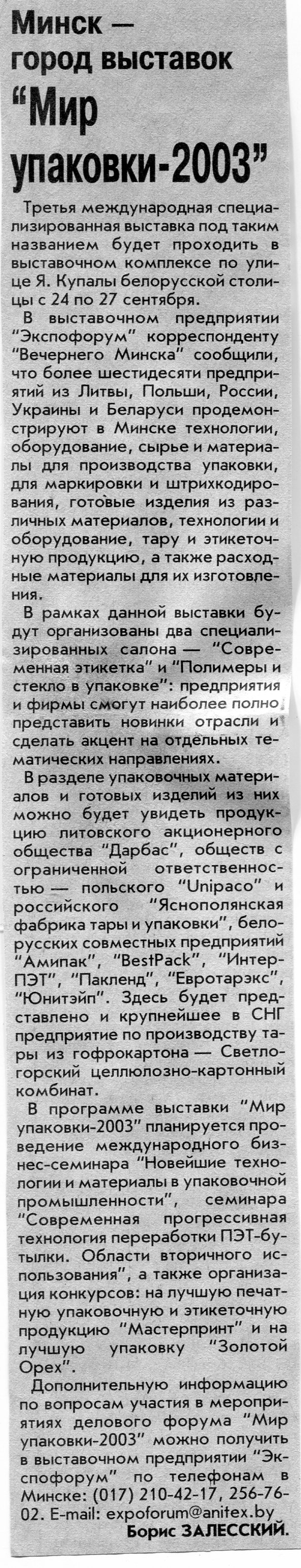 Залесский, Б. "Мир упаковки-2003" / Б. Залесский // Вечерний Минск. – 2003. – 20 авг.