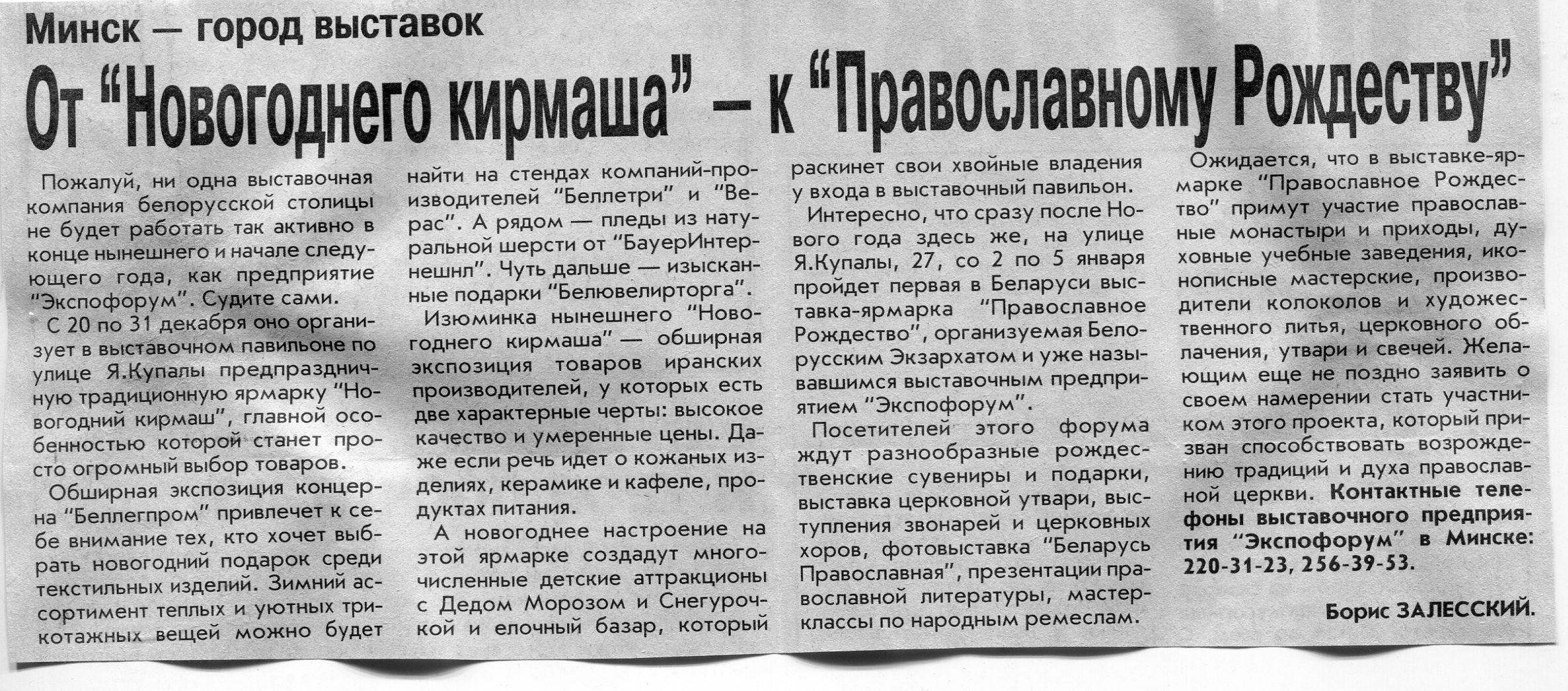 Залесский, Б. От "Новогоднего кирмаша" - к "Православному Рождеству" / Б. Залесский // Вечерний Минск. – 2002. – 18 дек.