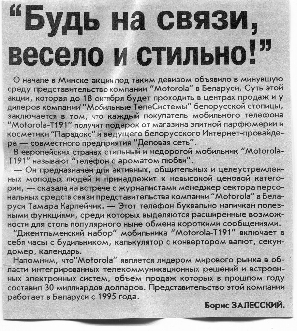 Залесский, Б. "Будь на с вязи, весело и стильно!" / Б. Залесский // Вечерний Минск. - 2002. - 20 сент.