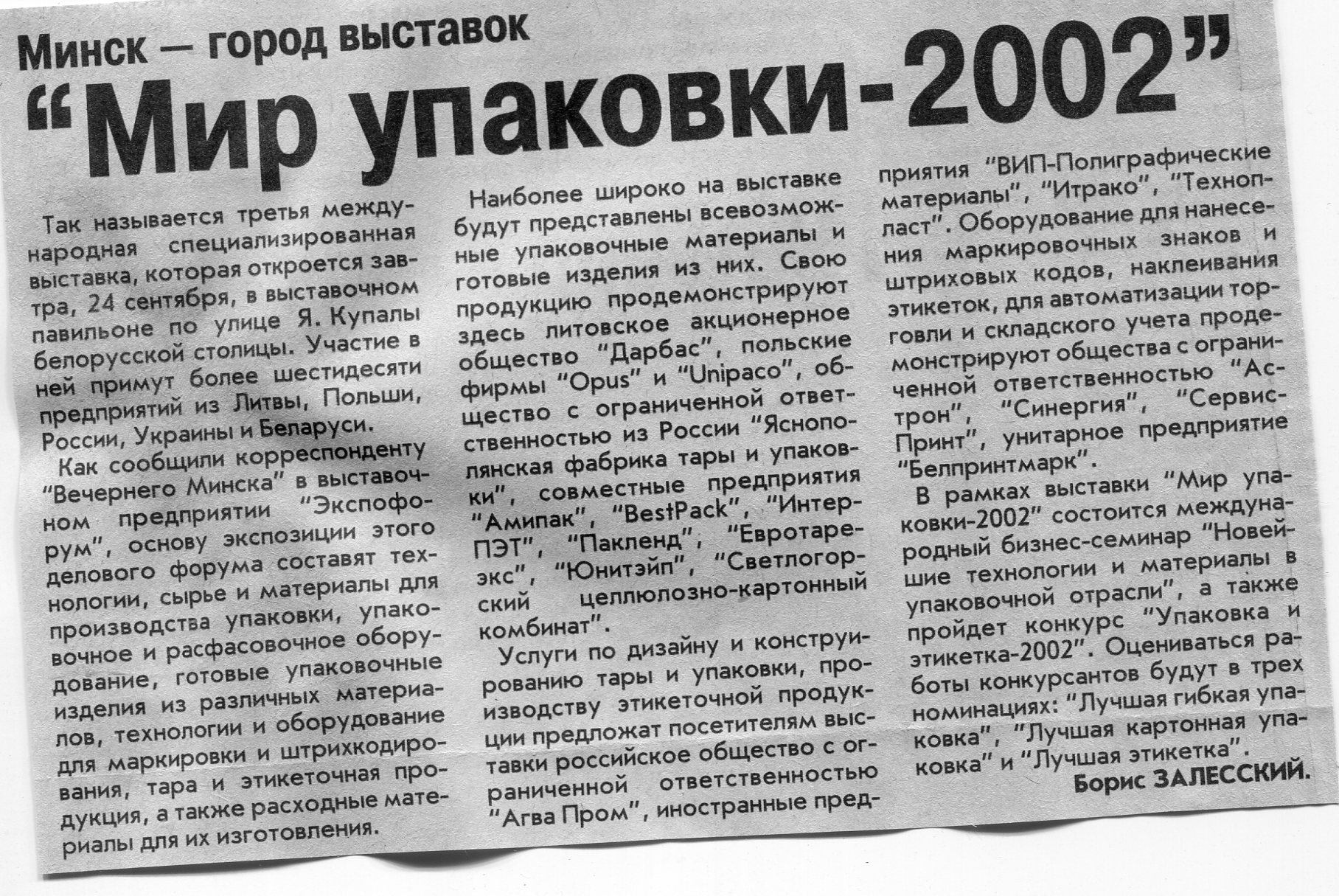 Залесский, Б. "Мир упаковки-2002" / Б. Залесский // Вечерний Минск. - 2002. - 23 сент.