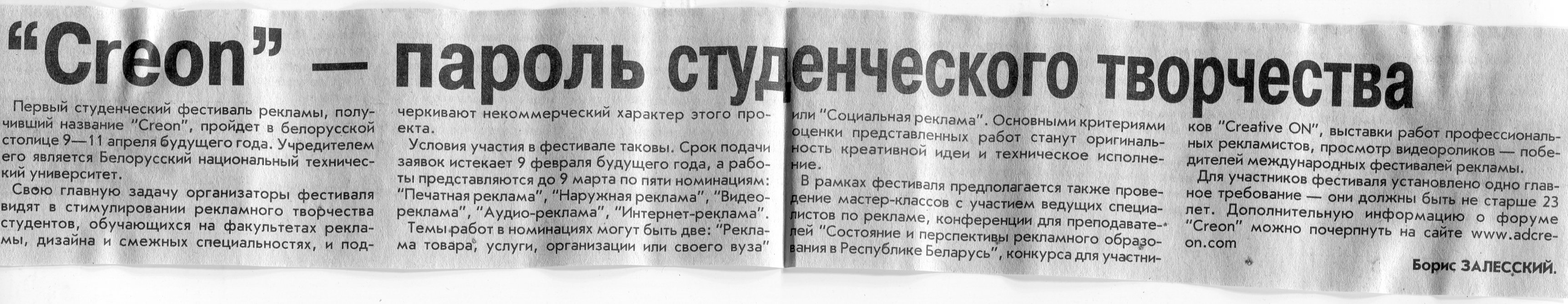 Залесский, Б. "Creon" - пароль студенческого творчества / Б. Залесский // Вечерний Минск. – 2002. – 23 дек.