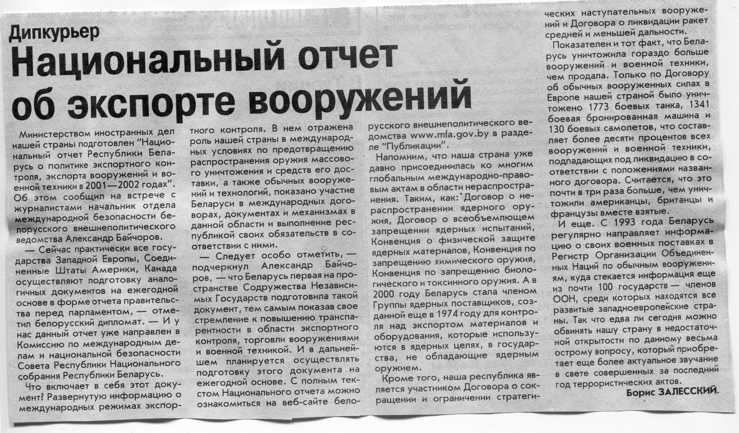 Залесский, Б. Национальный отчет об экспорте вооружений / Б. Залесский // Вечерний Минск. – 2002. – 5 нояб.