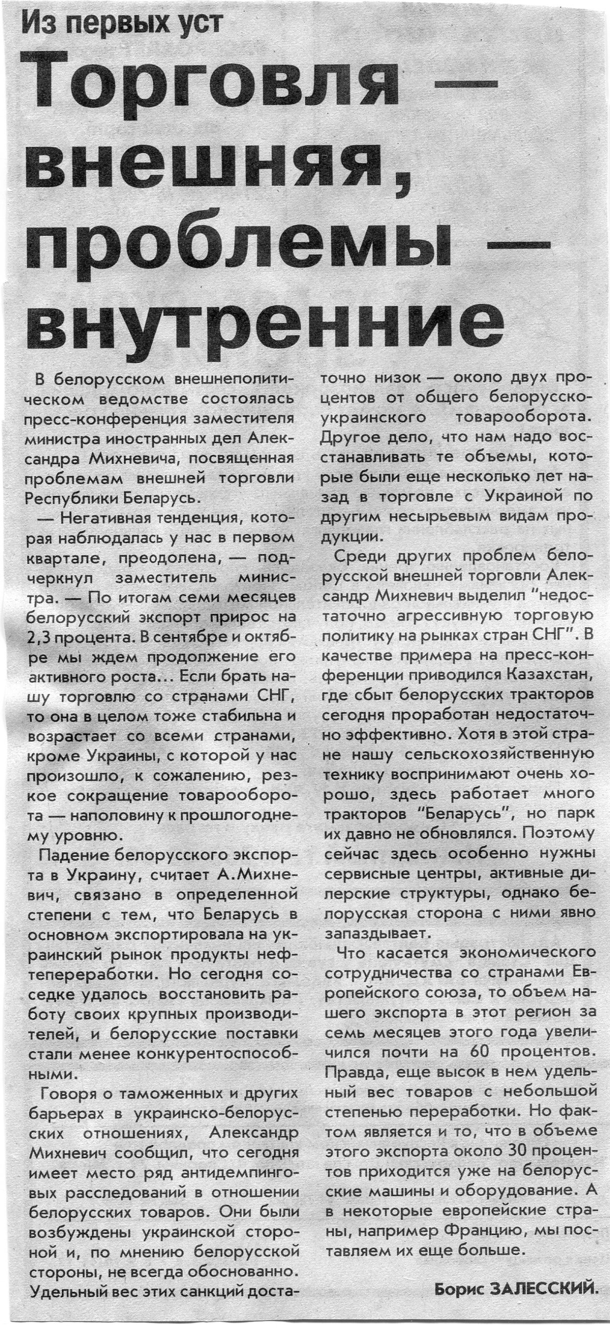 Залесский, Б. Торговля - внешняя, проблемы - внутренние / Б. Залесский // Вечерний Минск. – 2002. – 26 сент.