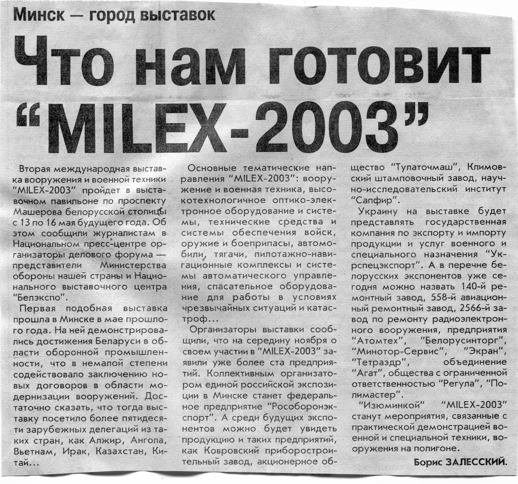 Залесский, Б. Что нам готовит "MILEX-2003" / Б. Залесский // Вечерний Минск. – 2002. – 9 дек.