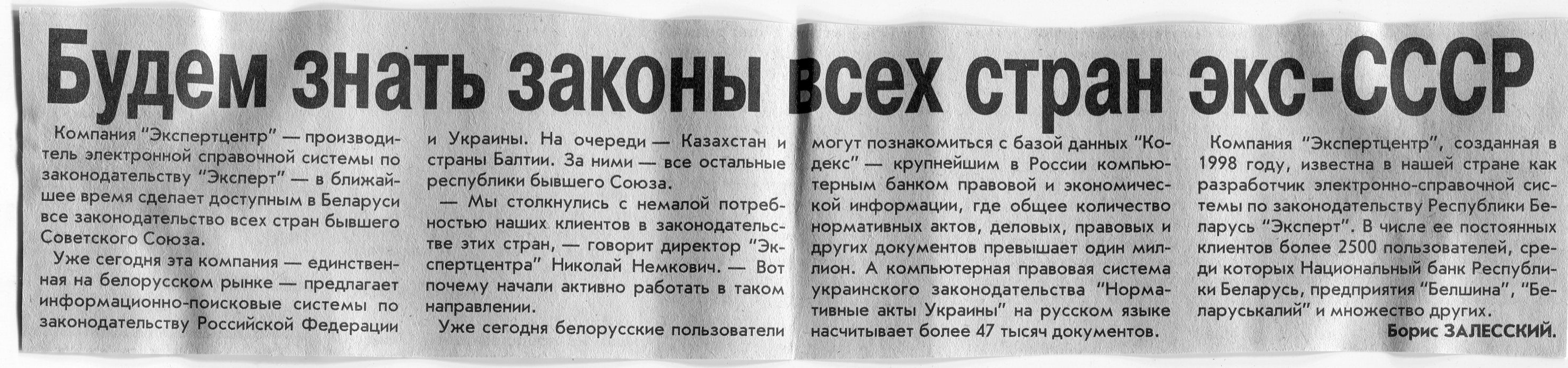 Залесский, Б. Будем знать законы всех стран экс-СССР / Б. Залесский // Вечерний Минск. – 2002. – 10 дек.