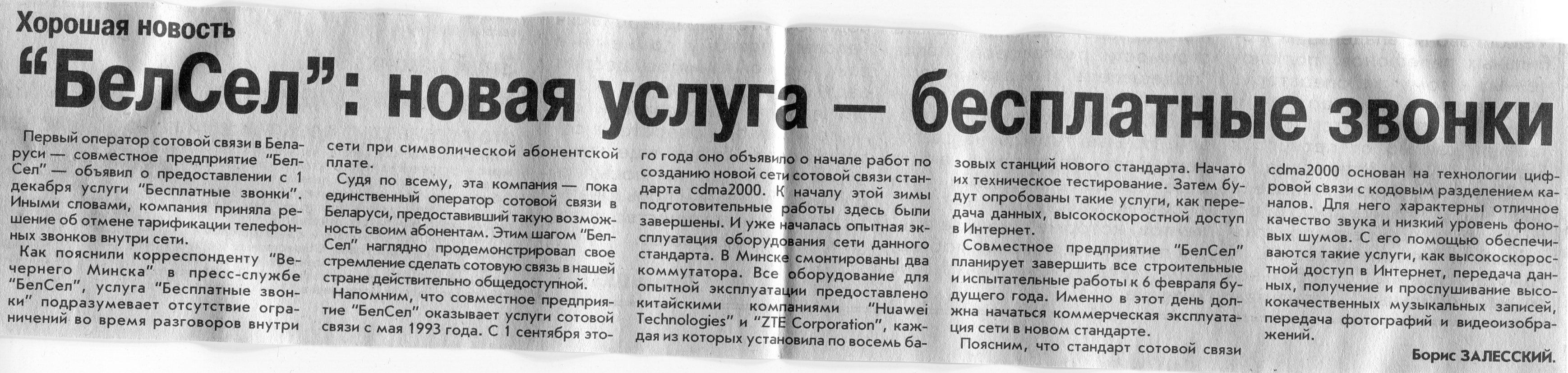 Залесский, Б. "БелСел": новая услуга - бесплатные звонки / Б. Залесский // Вечерний Минск. – 2002. – 6 дек.