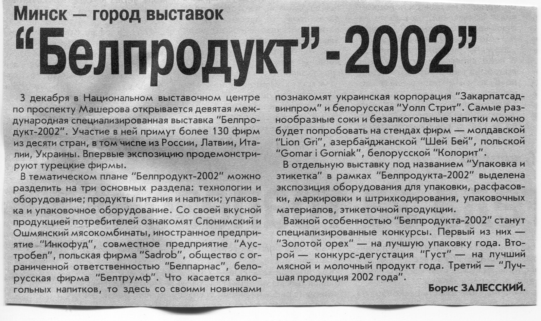 Залесский, Б. "Белпродукт-2002" / Б. Залесский // Вечерний Минск. – 2002. – 3 дек.