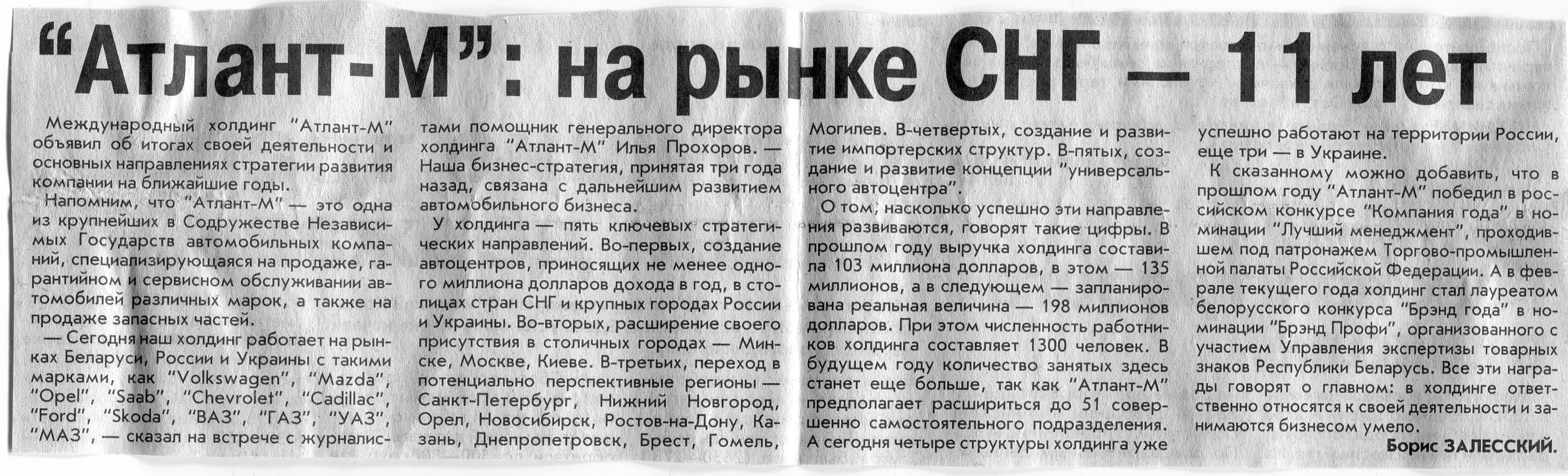 Залесский, Б. "Атлант-М": на рынке СНГ - 11 лет / Б. Залесский // Вечерний Минск. – 2002. – 28 нояб.