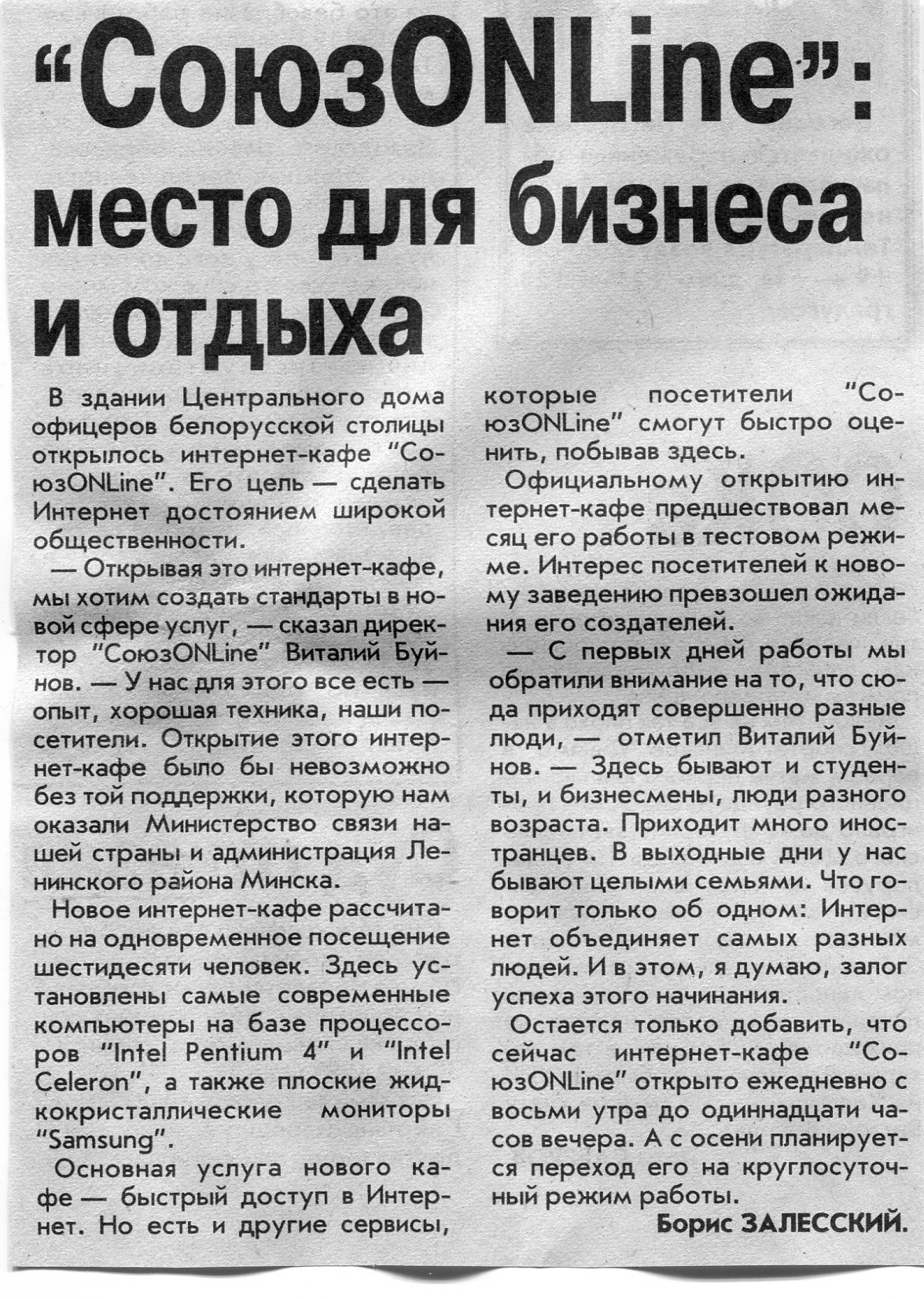 Залесский, Б. "СоюзONLine" место для бизнеса и отдыха / Б. Залесский // Вечерний Минск. - 2002. - 19 авг.