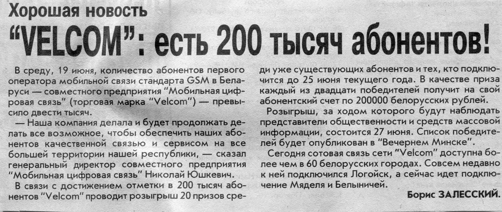 Залесский, Б. "Velcom": есть 200 тысяч абонентов! / Б. Залесский // Вечерний Минск. - 2002. - 21 июн.