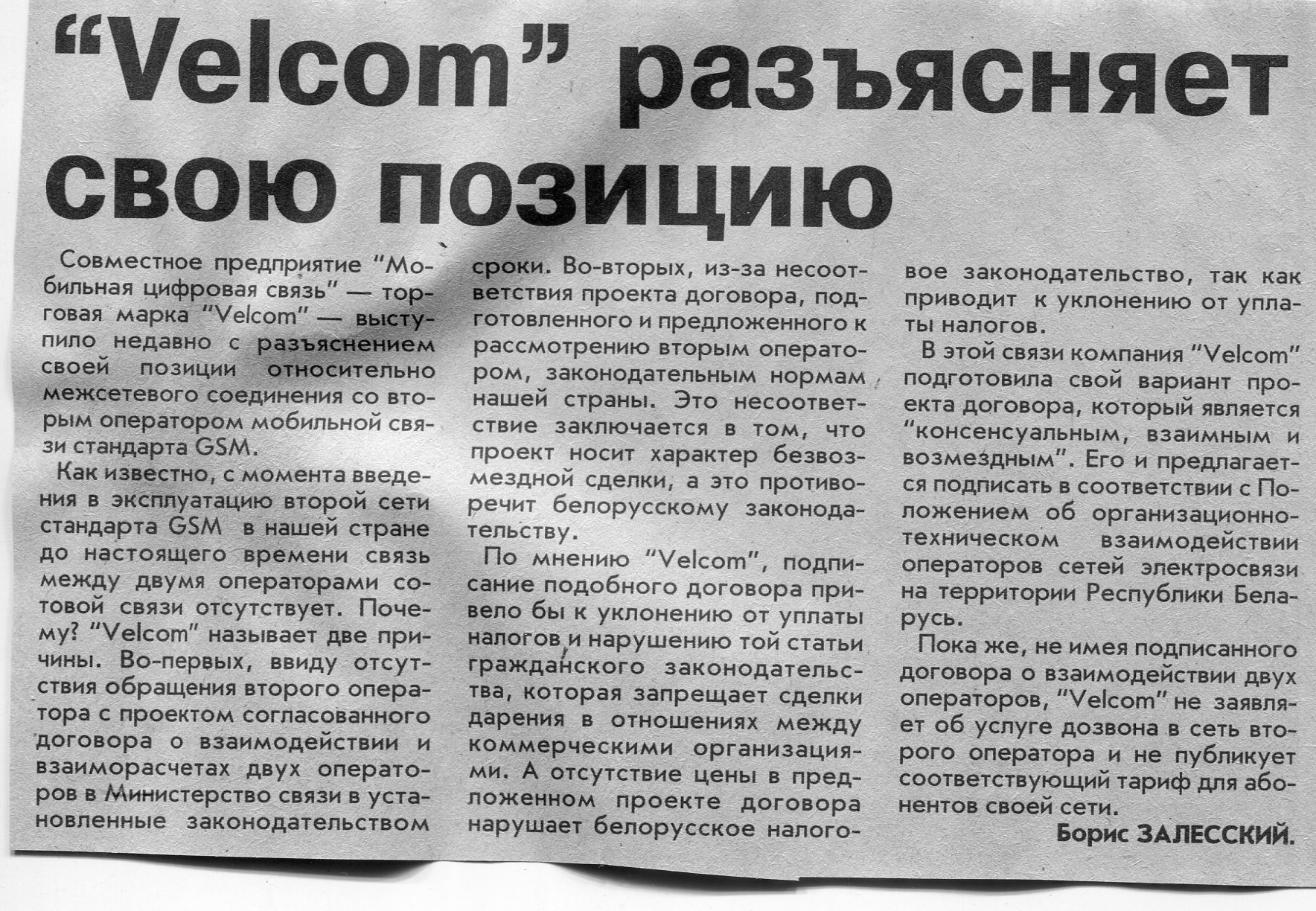 Залесский, Б. "Velcom" разъясняет свою позицию / Б. Залесский // Вечерний Минск. - 2002. - 26 июл.