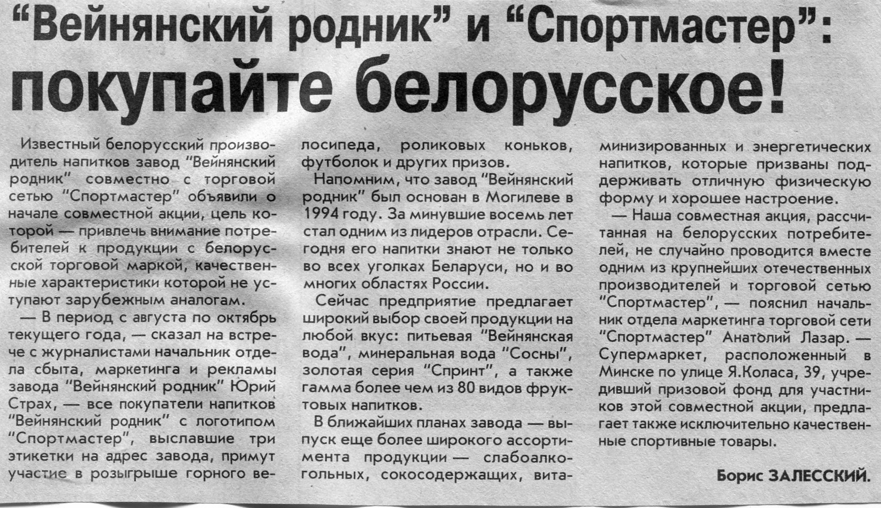 Залесский, Б. "Вейнянский родник" и "Спортмастер": покупайте белорусское! / Б. Залесский // Вечерний Минск. - 2002. - 26 авг.