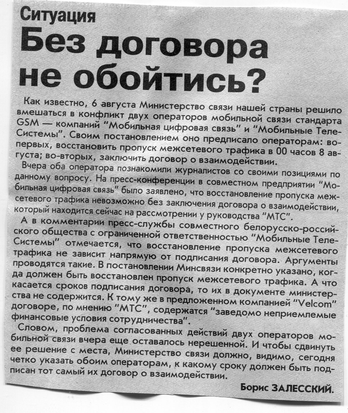 Залесский, Б. Без договора не обойтись? / Б. Залесский // Вечерний Минск. - 2002. - 9 авг.